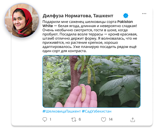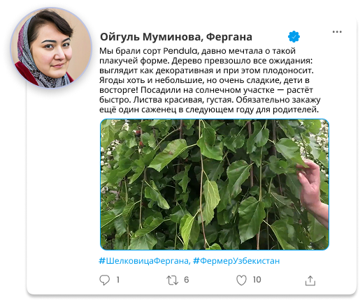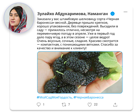 Эффектное дерево до 2–4 м в штамбовой форме. Ягоды до 10 см, тёмно-пурпурные, невероятно сладкие. Хорошо растёт в климатической зоне Узбекистана.